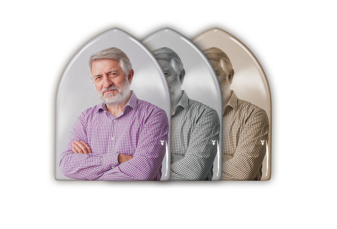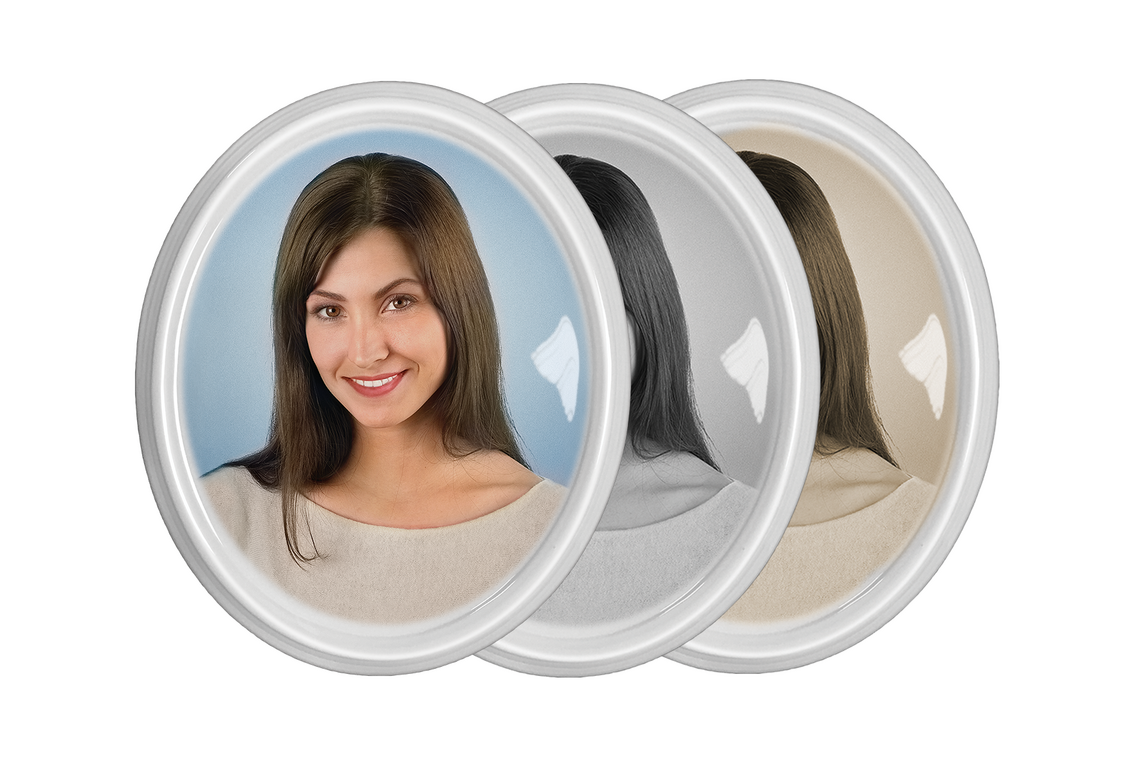 Valmistame hauaplaatide jaoks portreesid ebastandardsetes vormides metallist, keraamilistest, portselanist ja keraamilisest graniidist toorikutel, pakkudes laia valikut värvilahendusi: